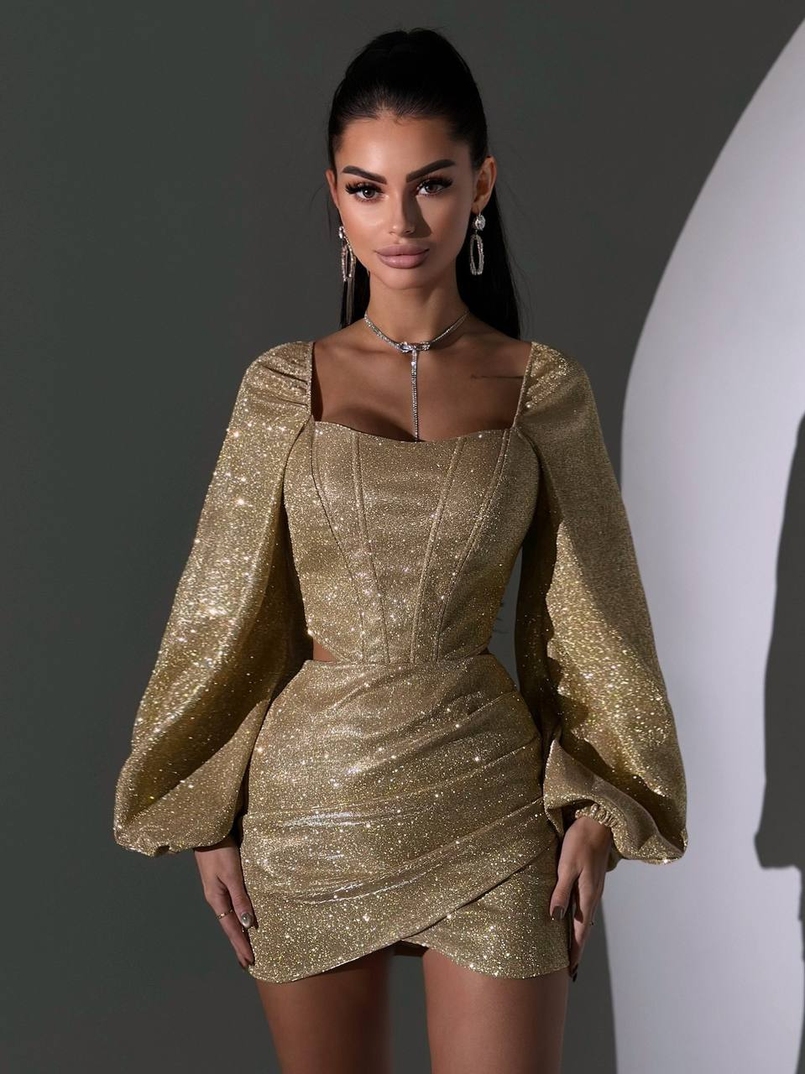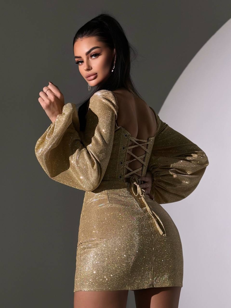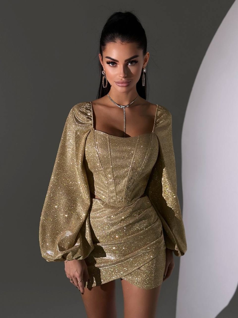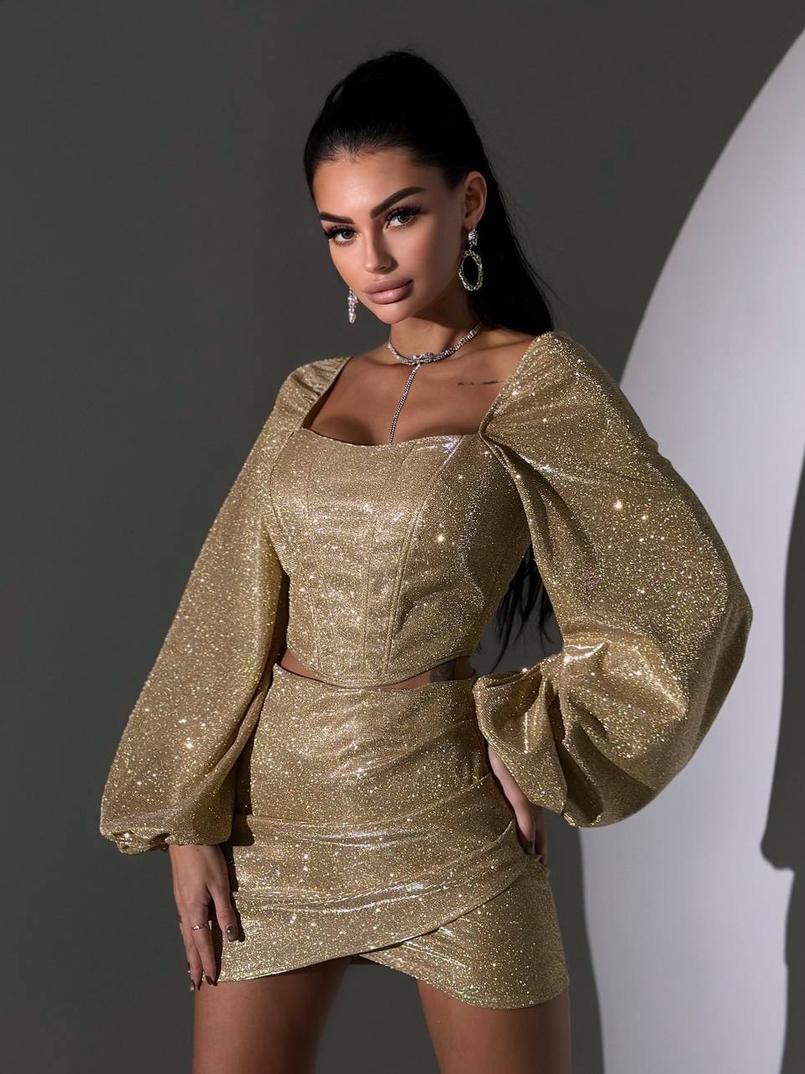 Сяючий комплект: корсет + спідниця міні з драпіруванням